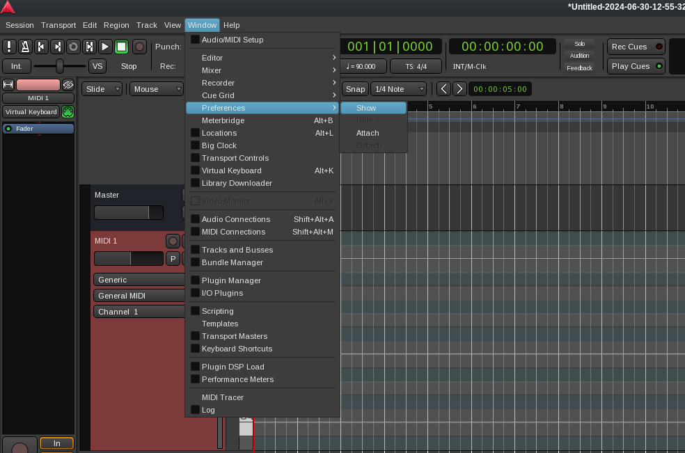 In the Ardour main menu, click on Window, then Preferences, then Show.