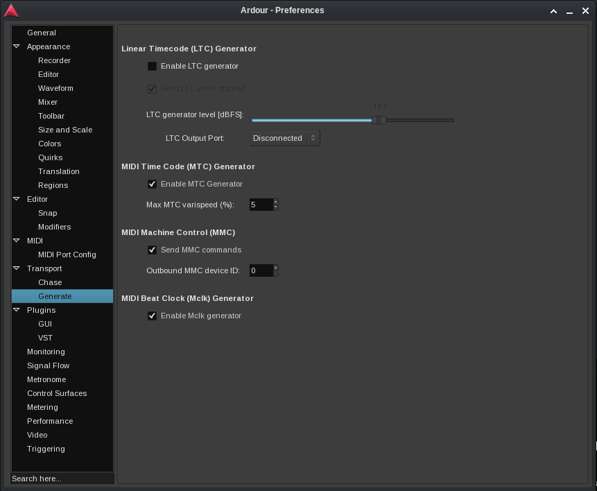 Look for the Transport section on the right and click on “Generate”. In the main panel, you’ll see the options for MIDI Time Code, MIDI Machine Control and MIDI Beat clock. Enable any or all of them as per your needs.