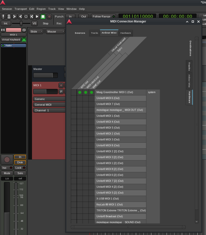 To use them, click on Window in the Ardour main menu, then select MIDI Connections. You can also use the default keyboard shortcut Shift-Alt-M. In the MIDI Connections window, make sure you’re in the Ardour Misc tab at the top, and the Hardware tab on the right, and you’ll be able to assign MMC, MTC and clock to your devices. In the example here, I’ve assigned all three to my Moog Grandmother. (This is just an example. I normally only send MIDI time code to my Grandmother, so that its arpeggiator and sequencer stay in sync with my Ardour session.)